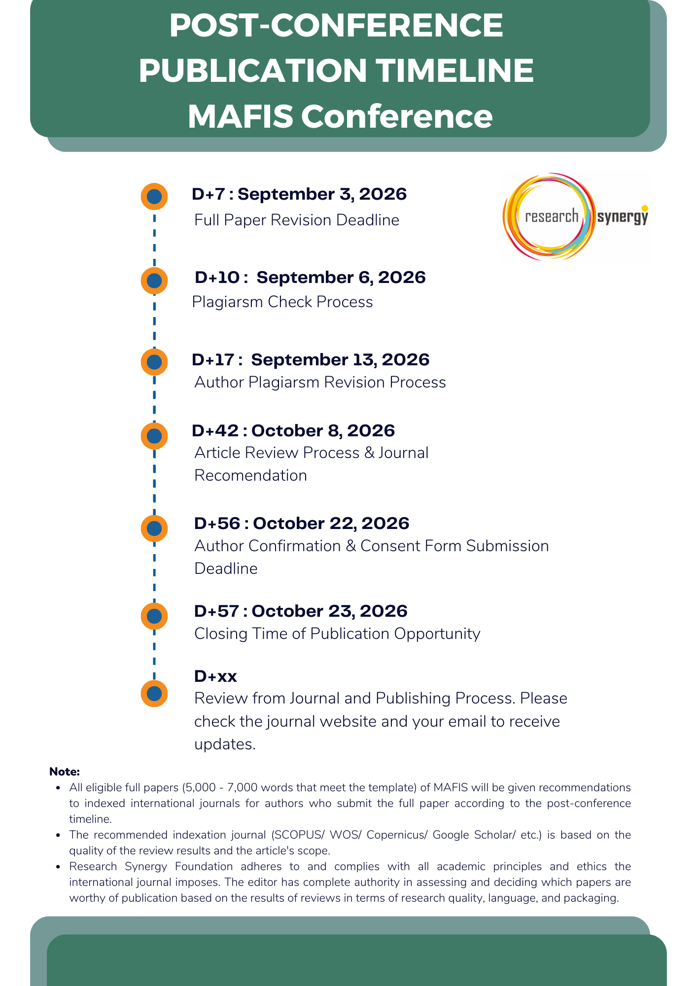 All manuscript which perform on those criteria will be recommended to Research Synergy journal affiliations (Author should follow journal’s submission).